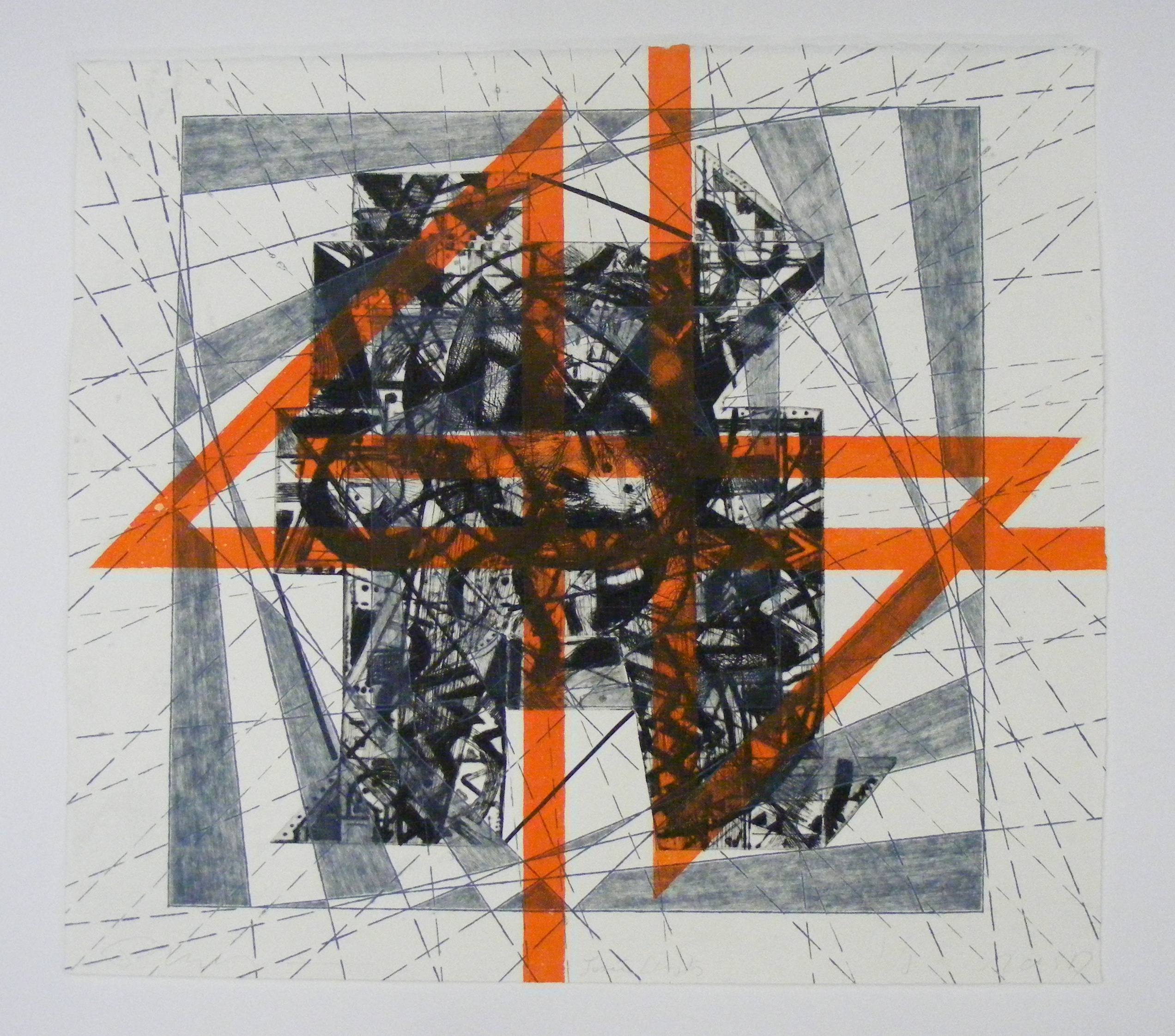 Deze prent is een combinatie van ets en droge naald. Centraal staat een monumentaal bouwwerk omgeven door een geometrisch spel van lijnen en vlakken. Opvallend is de combinatie van de kleuren zwartblauw, blauwgrijs en rood.