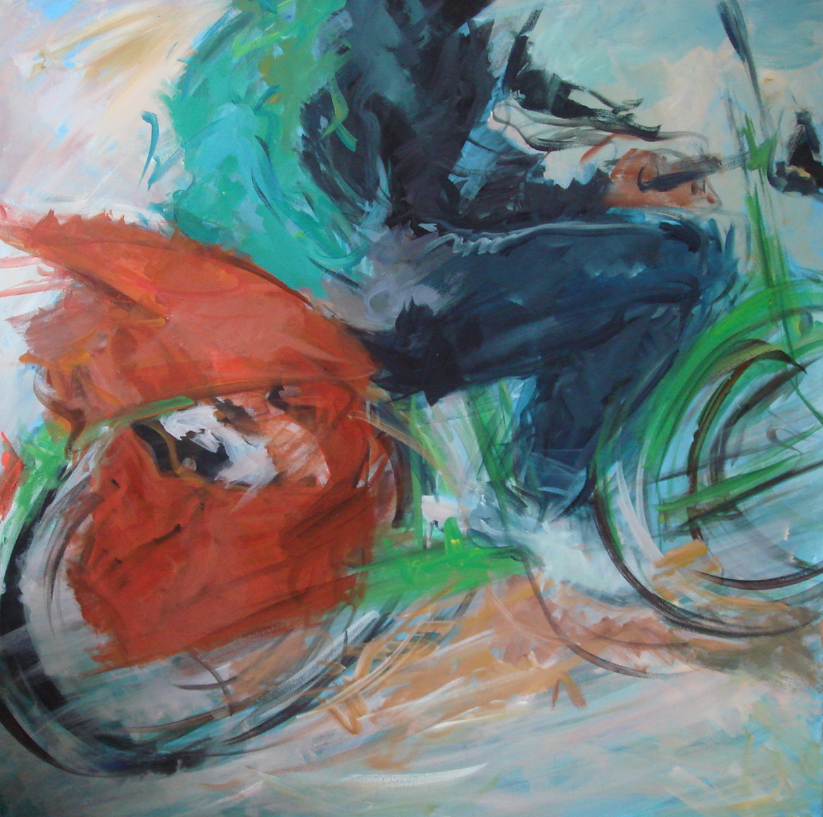 Wit Rood Oranje Zwart Blauw Acryl Expressief Groen Man Canvas Figuur Sport Beweging Realistisch Doek Acrylverf Roze Lichtblauw Fiets Fietser Jongen Donkerblauw Snelheid Snel Bewegend