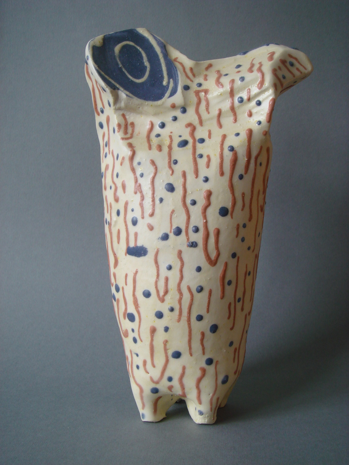 Wit Abstract Rood Blauw Vis Roze Patroon Druppels Keramiek Engobe Steengoed Aardewerk Vervormd Handgedraaid Gedraaid Keramische Cilinder