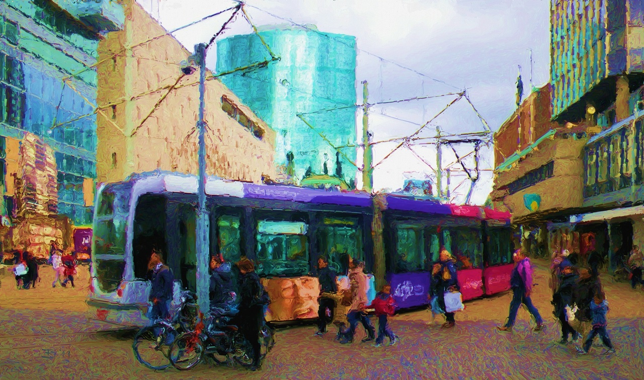 Hier rijd de tram door het drukste gedeelte van Rotterdam over de stoep