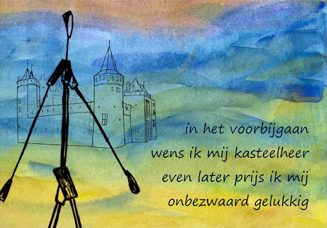 in het voorbijgaan wens ik mij kasteelheer even later prijs ik mij onbezwaard gelukkig Digitaal bewerkte aquarel en pentekeningen met tekst. Deze prent was bedoeld als onderdeel van MatchBoox de Wandelaar ONDERWEG, maar is geneuveld in het streven het luciferdoosboekje helder van lijn te houden. Bovendien kan deze prent heel goed op zichzelf staan. De pentekeningen zijn gemaakt door Bart Ensing. Print op A4-formaat, in passe-partout in aluminiumlijst van 40x30cm.