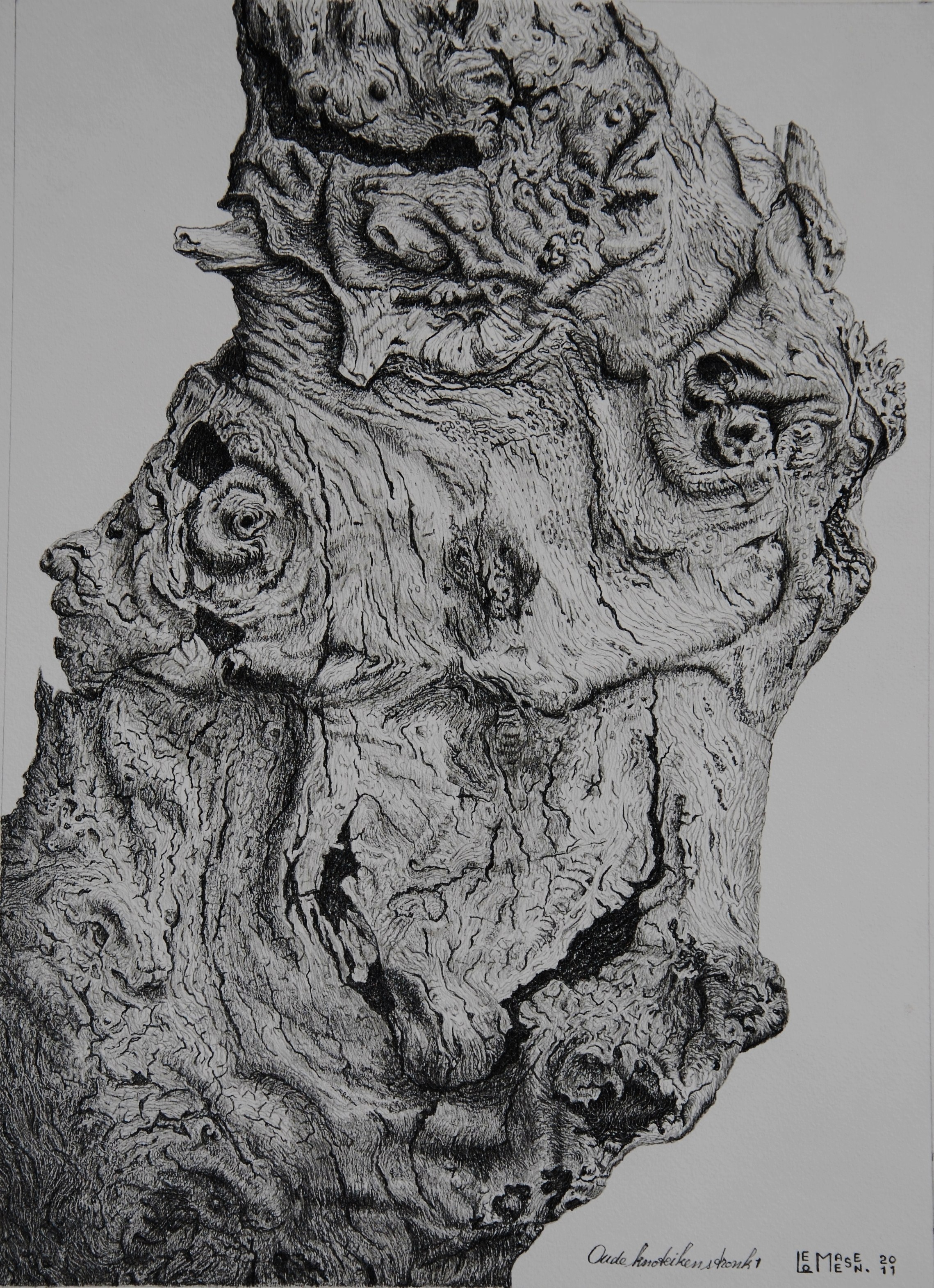 Deze gedeeltelijk verrotte zeer oude knoteikenstronk vond ik tijdens een wandeling. Hij heeft zijn leven geleefd en is vele malen van zijn takken ontdaan tot hij het snoeien niet meer verdragen kon. Nu is hij een dankbaar onderwerp om van alle kanten te tekenen.