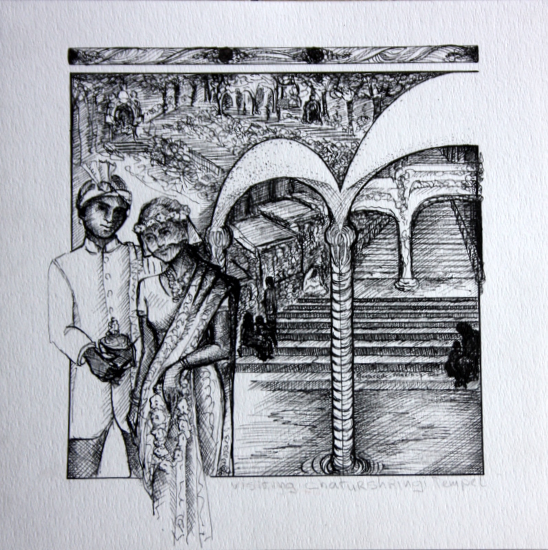 India Bruidspaar Tempel Trappen Pentekening