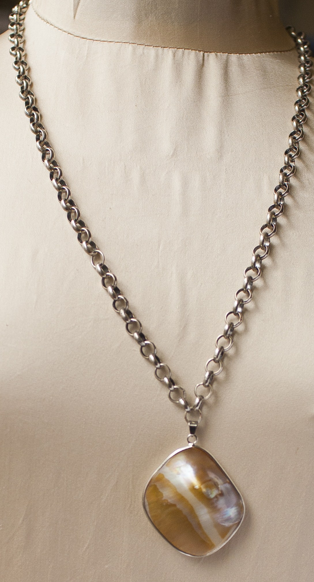 Collier Isabelle. Zilver ketting met ingelijst in zilver parelmoerschelp - hanger.
