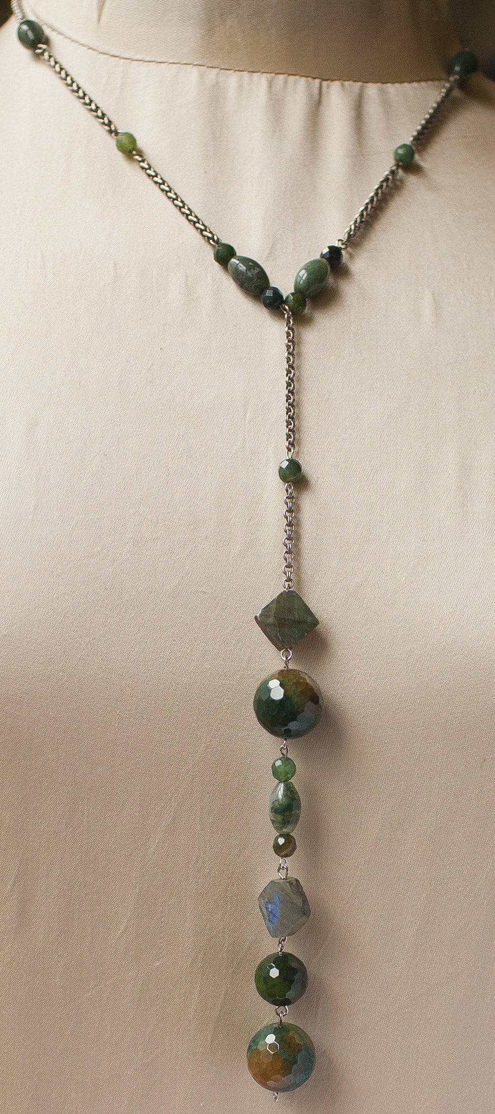 Collier Licht, samengesteld van Groene Agaat,Labradoriet,zilber ketting. De achter kant is afgewerkt met een pendent.Agaat is een variant chalcedoon en kan wit, grijzig, blauw, roodachtig en verschillende bruintinten zijn met smalle banden in verschillende kleuren. Afhankelijk van de kleur en banden onderscheidt men verschillende varianten zoals: blauwe veteragaat, boomagaat, Botswana agaat, mosagaat, turitella agaat en vuuragaat. De steen is licht doorschijnend en heeft een matte tot zijdeglans Agaat is een aardende, stabiliserende en beschermende steen. De steen bevordert innerlijke rust en een kalme en nuchtere houding. Het stimuleert spirituele en geestelijke groei door aan te zetten tot zelfreflectie en spoort aan even afstand te nemen en alles wat objectiever te bekijken. Het bevordert rationeel en logisch denken, concentratie, het analytisch vermogen en helpt daarom om praktische oplossingen te vinden voor problemen. Labradoriet kan kleurloos, grijs, wit en groen zijn met stukken met een blauwe, groene of geelachtige glans als het gepolijst is. Werking Labradoriet is een sterk beschermende en spirituele steen. Het beschermt het eigen energieveld (aura) tegen negatieve invloeden uit de omgeving en mensen die energie bij je wegnemen