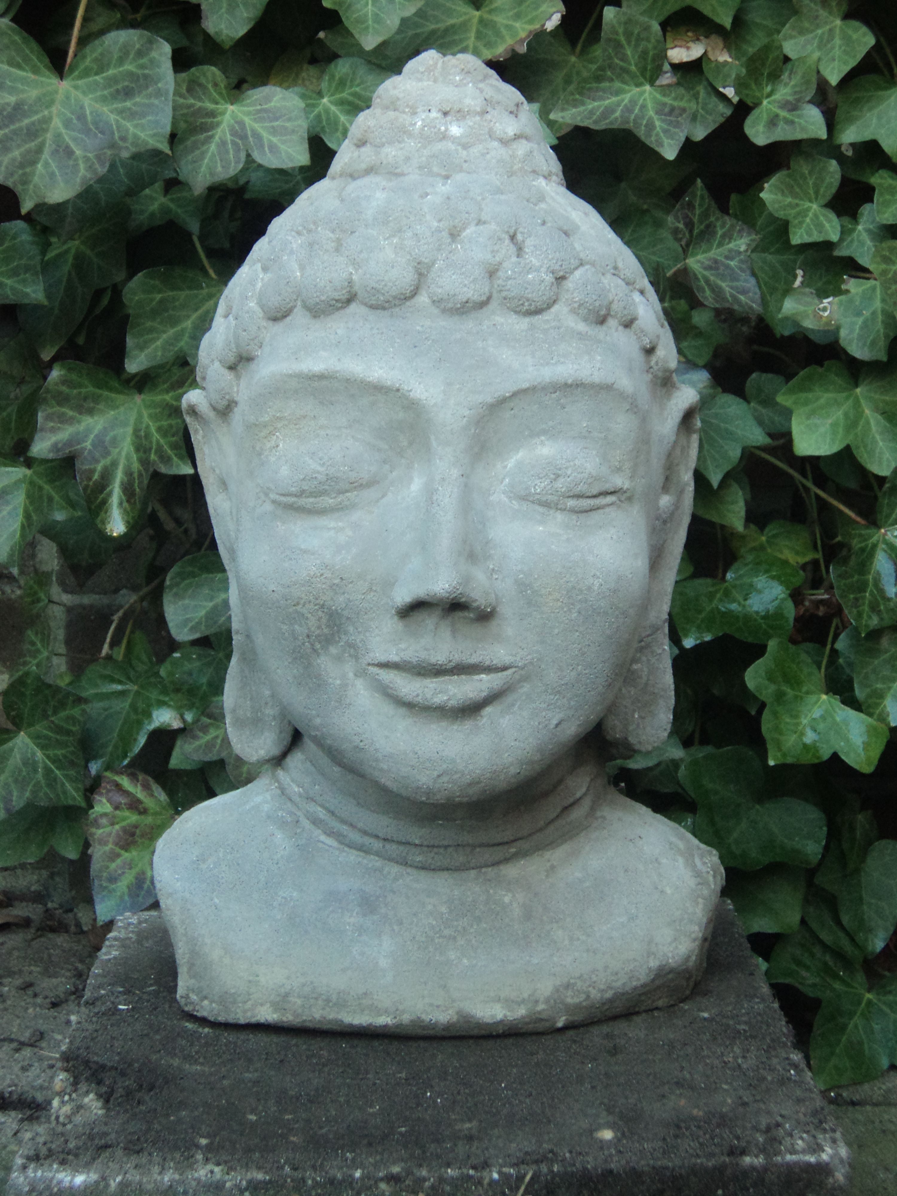 Dit Boeddha hoofd is gemaakt van aluminiumcement en is mijn eerste project met aluminiumcement. Het beeld is in eerste instantie van klei gemaakt en daar omheen is een mal gemaakt van gips. Na het hard worden van het gips, word het beeld van klei uit de mal gehaald en de mal word volgegoten met aluminiumcement. De mal is in één keer gegoten, waardoor er géén achterhoofd is, de achterkant is dus vlak.