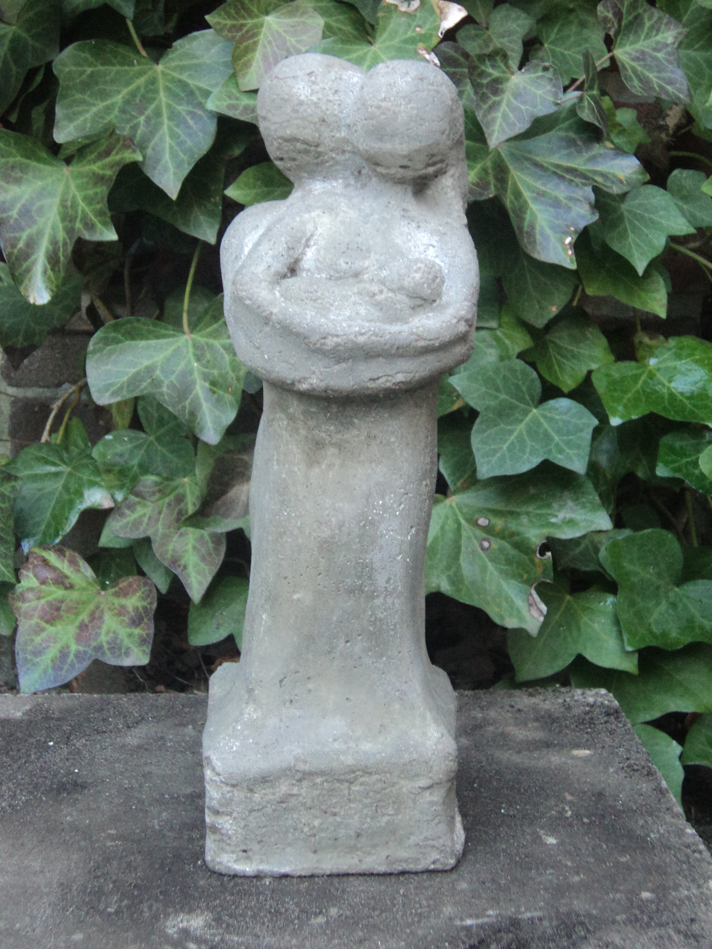 Dit is het tweede aluminiumcementbeeld wat ik heb gemaakt. Het is ontstaan uit een puur gevoel voor een vriendin. En nu een gelukkige moeder is geworden. Man en vrouw omarmen een nieuw geluk. Allereerst is er een beeld gemaakt van klei, daar is een mal van gemaakt van gips. Deze mal is in twee delen gemaakt.De twee (mal)delen zijn nodig om het klei er goed uit te krijgen, alvorens je de mal kan volgieten met aluminiumcement. Na het verwijderen van de gipsen mal kan er een kleine gietnaad te zien zijn deze kan nog worden verwijderd wanneer het cement nog niet helemaal uitgehard is. Je kunt deze helemaal weghalen, maar ikzelf vind het wel zijn charmes hebben. Ik schuur het wel glad, maar werk de naad niet helemaal weg. Bij dit beeldje is de mal zo goed gelost dat het kleibeeld er nagenoeg heel uit is gekomen en waardoor ik een tweede mal heb kunnen maken en zo ook dus een tweede beeld heb kunnen gieten. Hetgeen wel bijzonder is, doordat het kleibeeld vaak kapot gaat tijdens het verwijderen van de klei uit de gipsmal. Maar ik had dus beginnersgeluk!