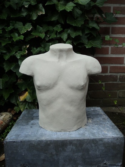 Deze torso is een opdracht voor een goede vriend en vriendin geweest en staan in hun nieuwe huiskamer te pronken. Gemaakt van grove chamotte klei, onbehandeld.