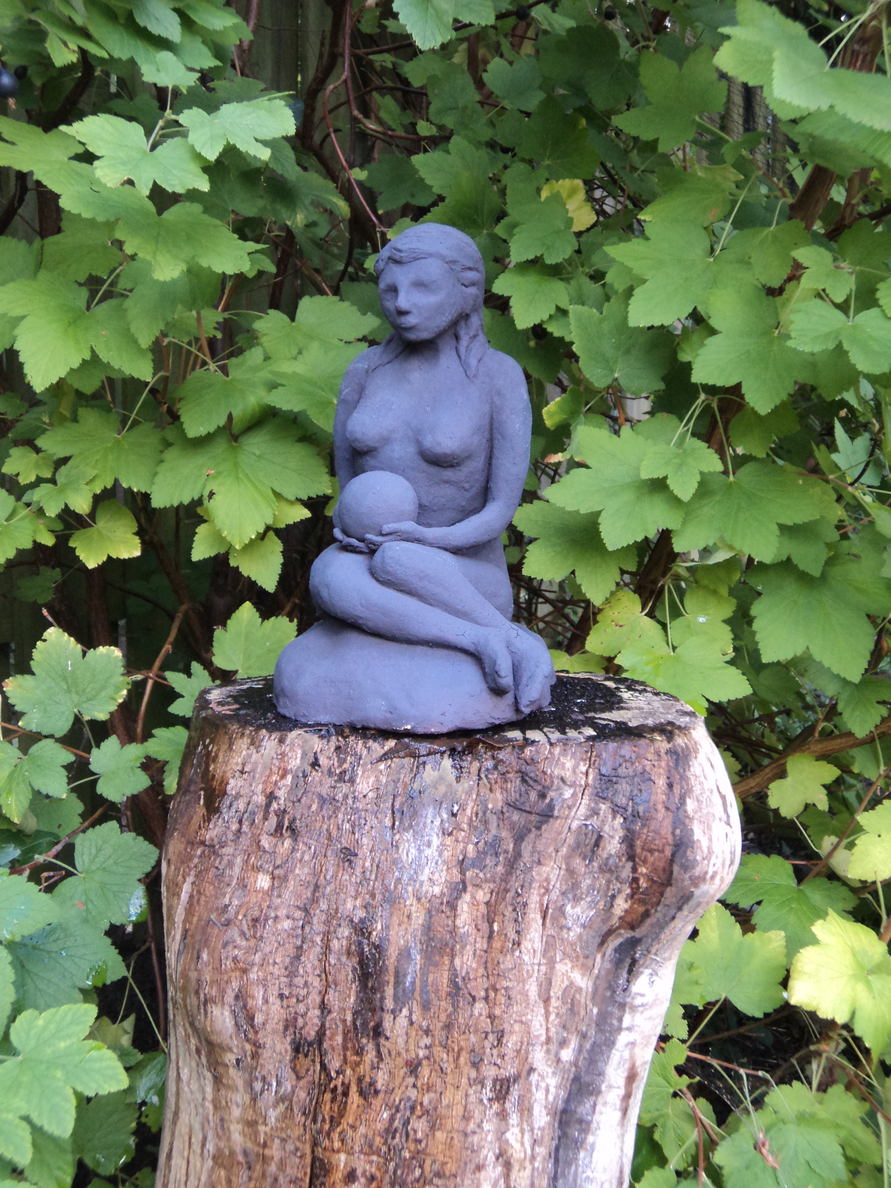 Boetseren doe ik met gevoel, dát is juist ook zo mooi aan boetseren. Je kunt je hoofd leegmaken en je handen het werk laten doen. Zo is ook dit beeldje ontstaan. Het was een moeilijke, sobere, ook een beetje trieste beleving. Wat je ook in dit beeld kunt zien. Donker van kleur, holle ogen, sobere houding en "dom", staren naar een bal in je handen. Gewoon het eventjes niet meer weten.......... Het beeldje is niet geweldig, maar is voor mij heel duidelijk aan een periode gekoppeld en zal het daarom nooit wegdoen......... Het is gemaakt zoals veel beeldjes van mij van grove chamotte, is donker geglazuurd en is dof/mat.
