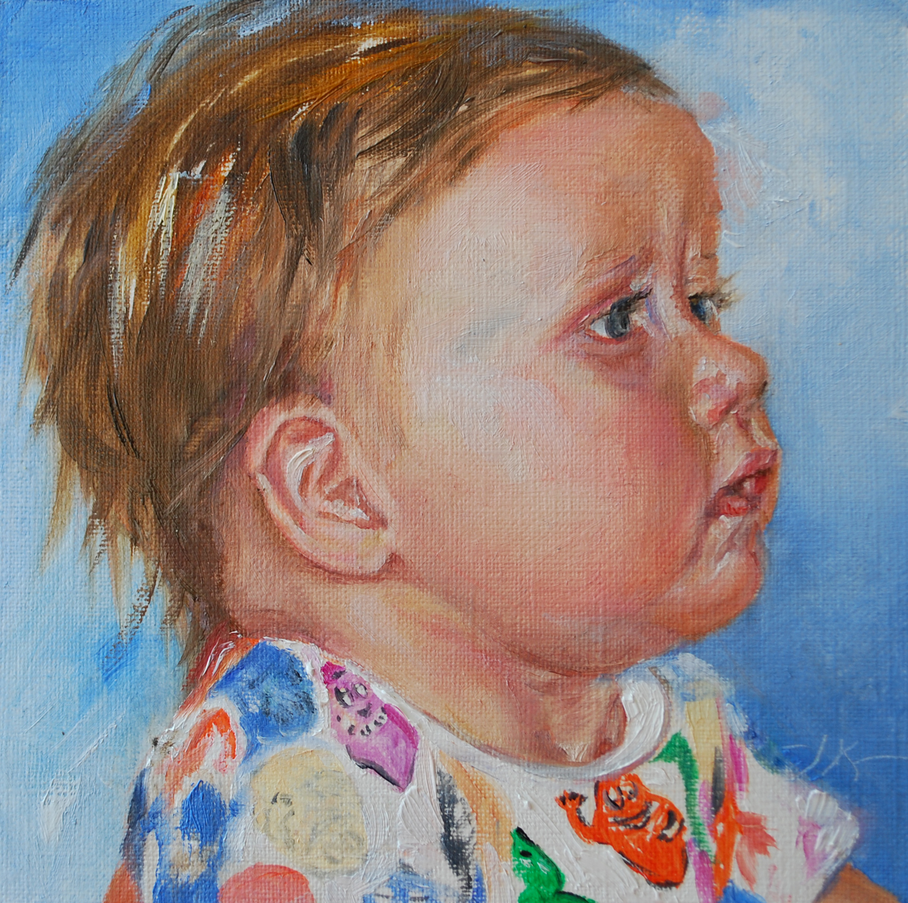 Olieverf schilderij één uit een serie van "baby Joris", maat 14 x 14 cm olieverf op paneel. Baby Joris wordt iedere maand geschilderd als een soort dagboek, om zo de veranderingen aan te geven in groei van zowel de baby als mijzelf als schilder.