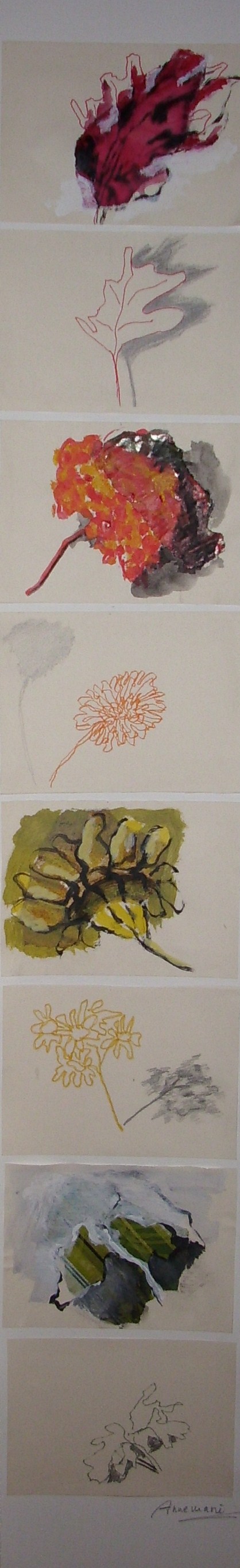 Getekende impressie van een bloem en daarna een collage van dezelfde bloem. Vier verschillende bloemen.