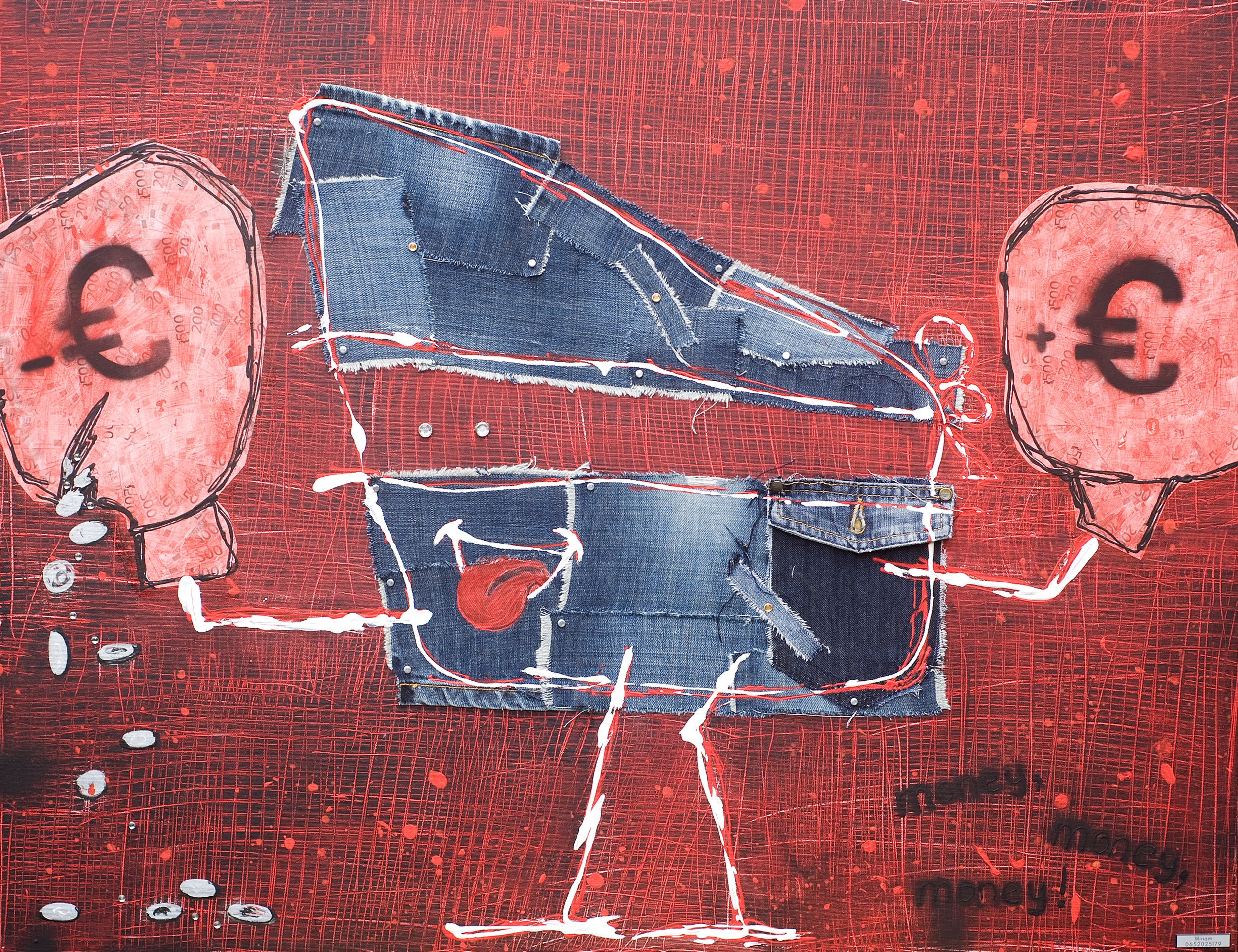 Een schilderij van een mens figuur die dol is op geld en het graag uitgeeft. Want uiteindelijk draait alles om geld! In het jeans achterzakje is een muntje van € 0,10 verwerkt.