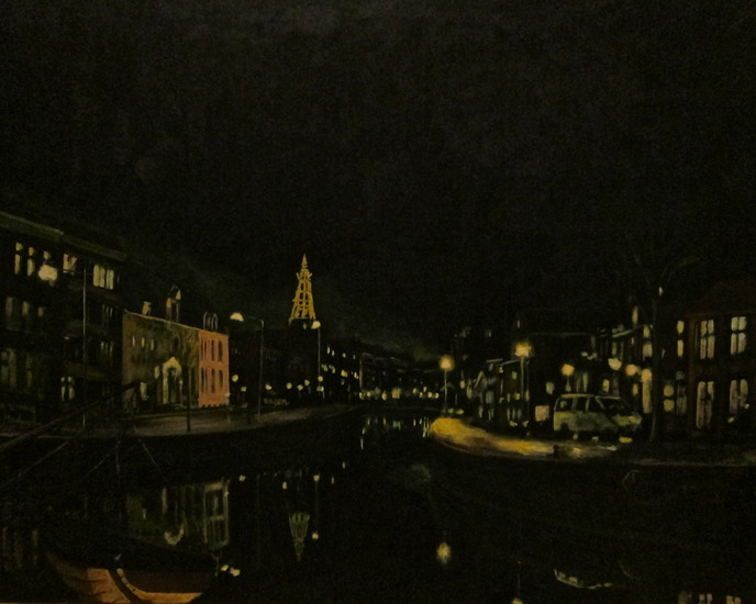 Groningen om vijf voor vierentwintig uur. Een van de mooiste beelden van de stad met de A kerk de Hoge en Lage A en cafe de Sleutel en Cafe Havenzicht vanaf de Noorderhaven noordzijde met de rug naar het Noorderplantsoen.