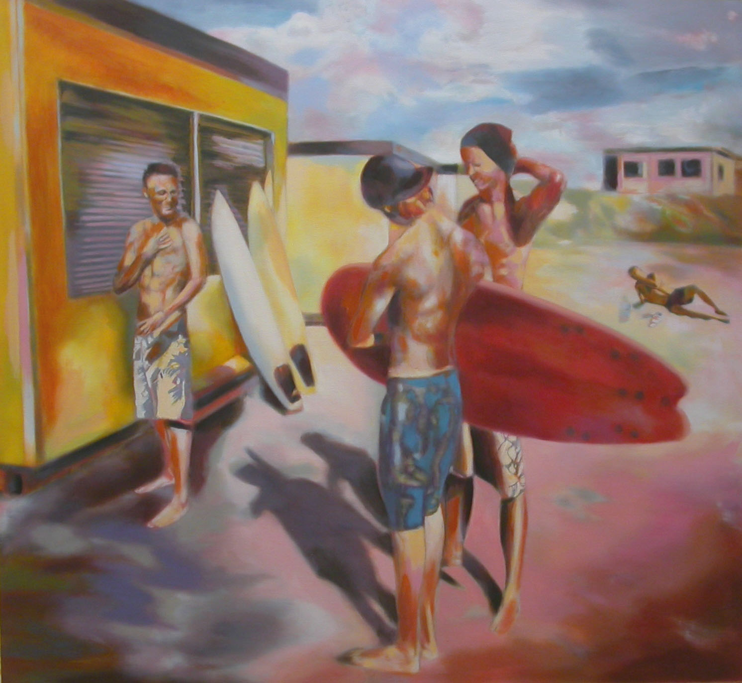 Olieverf Op Doek Kleurig Kleur Mensen Surfen Surfboard Zee Strand Strandhuis Strandcafe Wind Praten Zonnen Handdoek Petje Haar Lichamen Zon Zand Golf Hand Arm Been