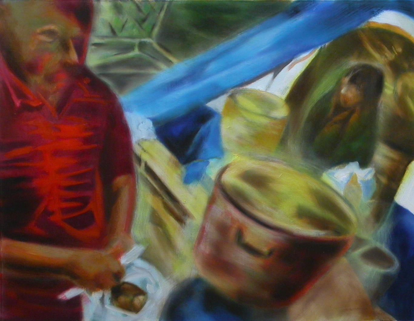 Eten Dinner Polen Gastarbeider Rood Figuren Koken Buiten Kamperen Thuisland Nederland Thuis Pannen Vuur Hout Kleur Olieverf Doek Vreemdeling Anders Overleven Vakantie Werken