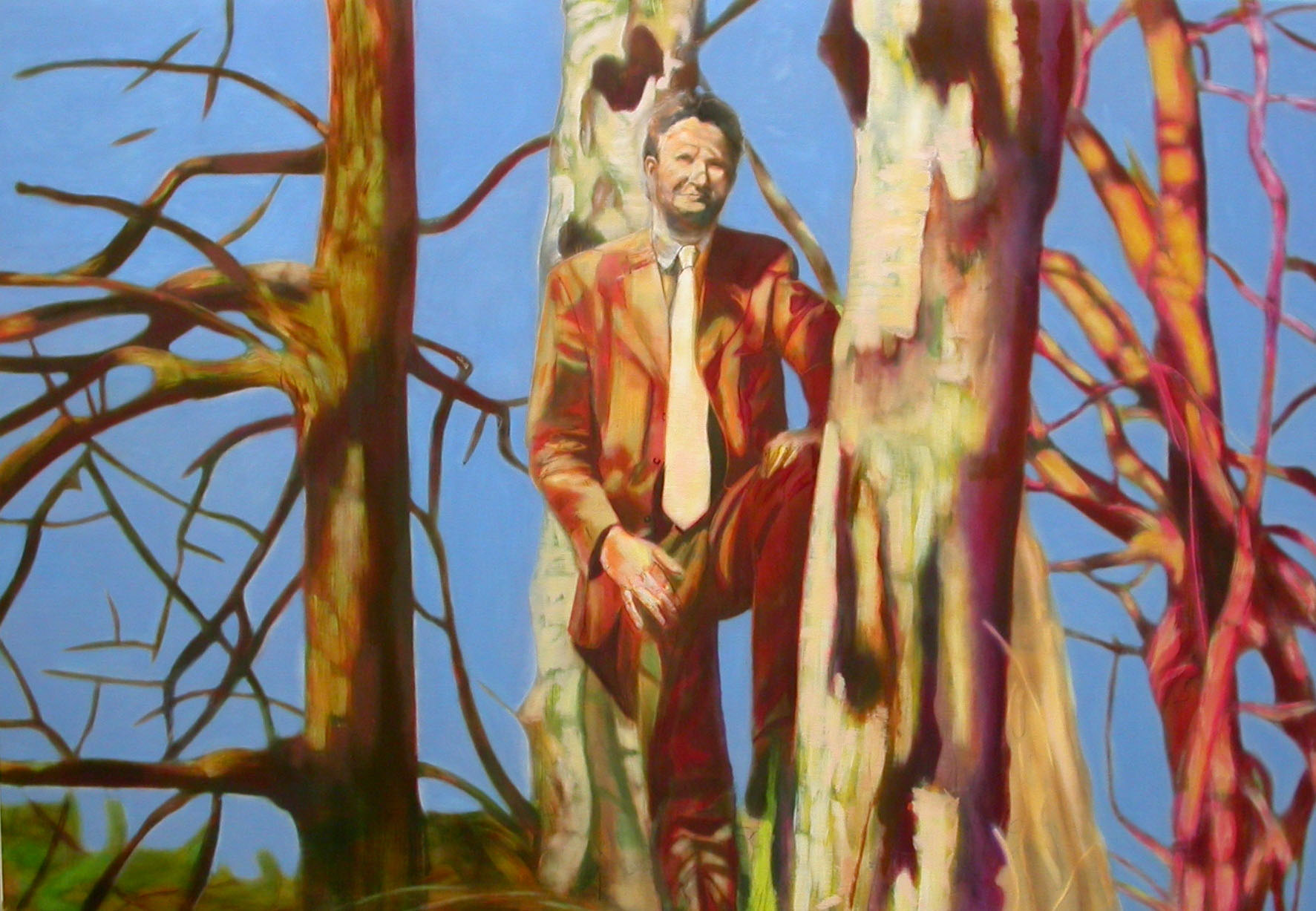 Olieverf Doek Op Bomen Kleur Man Maatpak De Natuur Biologie Bioloog Klimmen Studie Studeren Bestuderen Natuurbeleving Schors Boomschors Schoenen Aangekleed In
