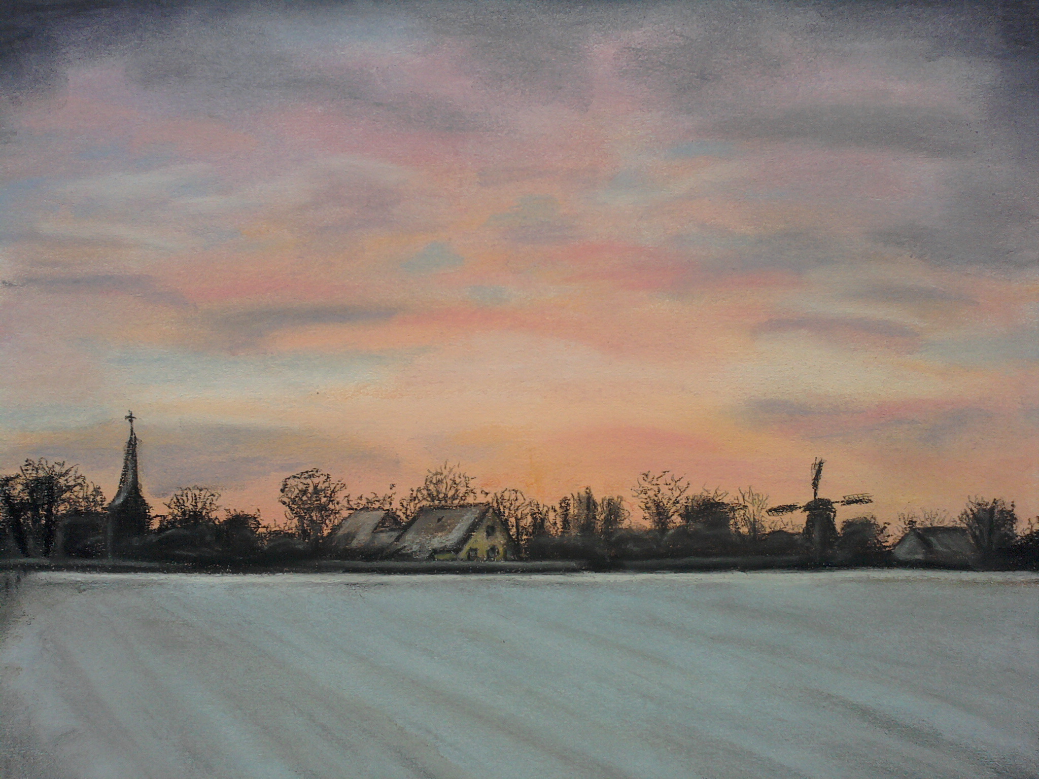 Dorpsgezicht Winter Sneeuw Zonsopkomst Pastel