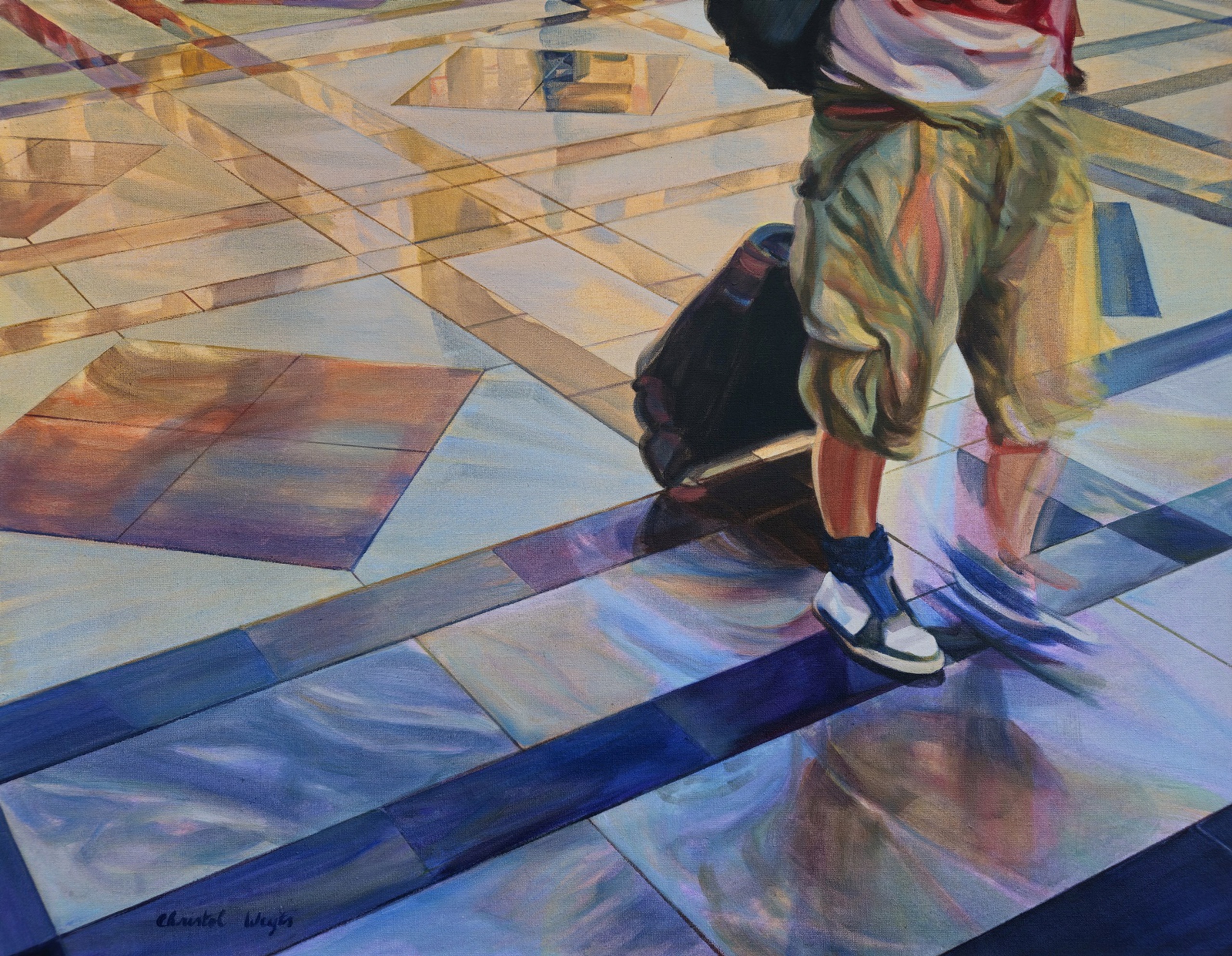 Acryl Man Licht Light Jongen Afscheid Spiegeling Lijnen Station Tegels Vloer België Floor Tiles Vertrek Leaving Weyts Antwerpen-centraal