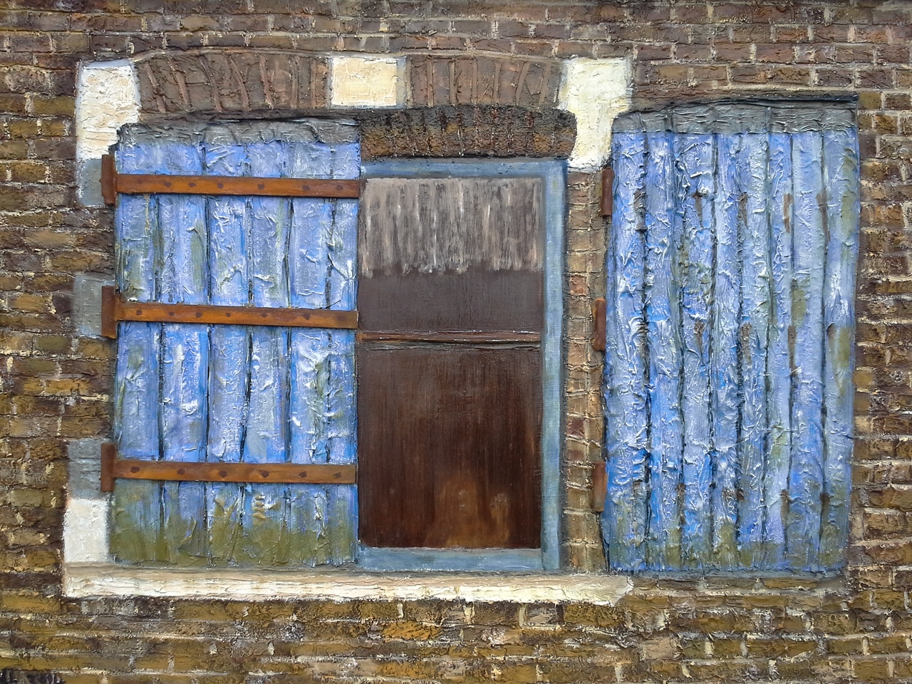huis met blauwe luiken, acryl en olieverf, mixed media,met houten baklijst