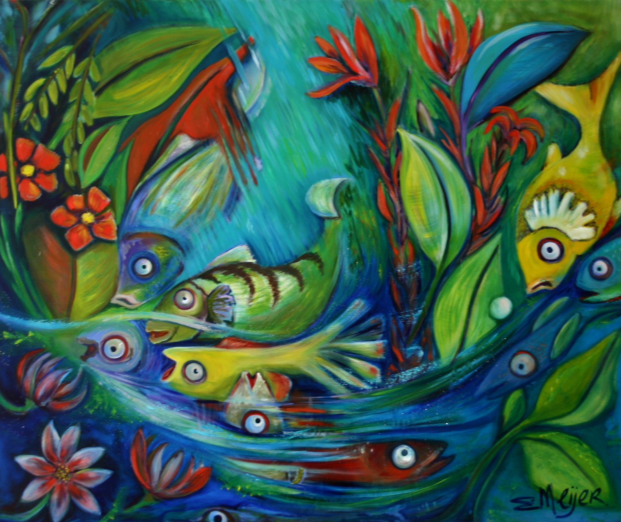 Levendig schilderij, met vissen en planten en bloemen, er valt vanalles te zien.