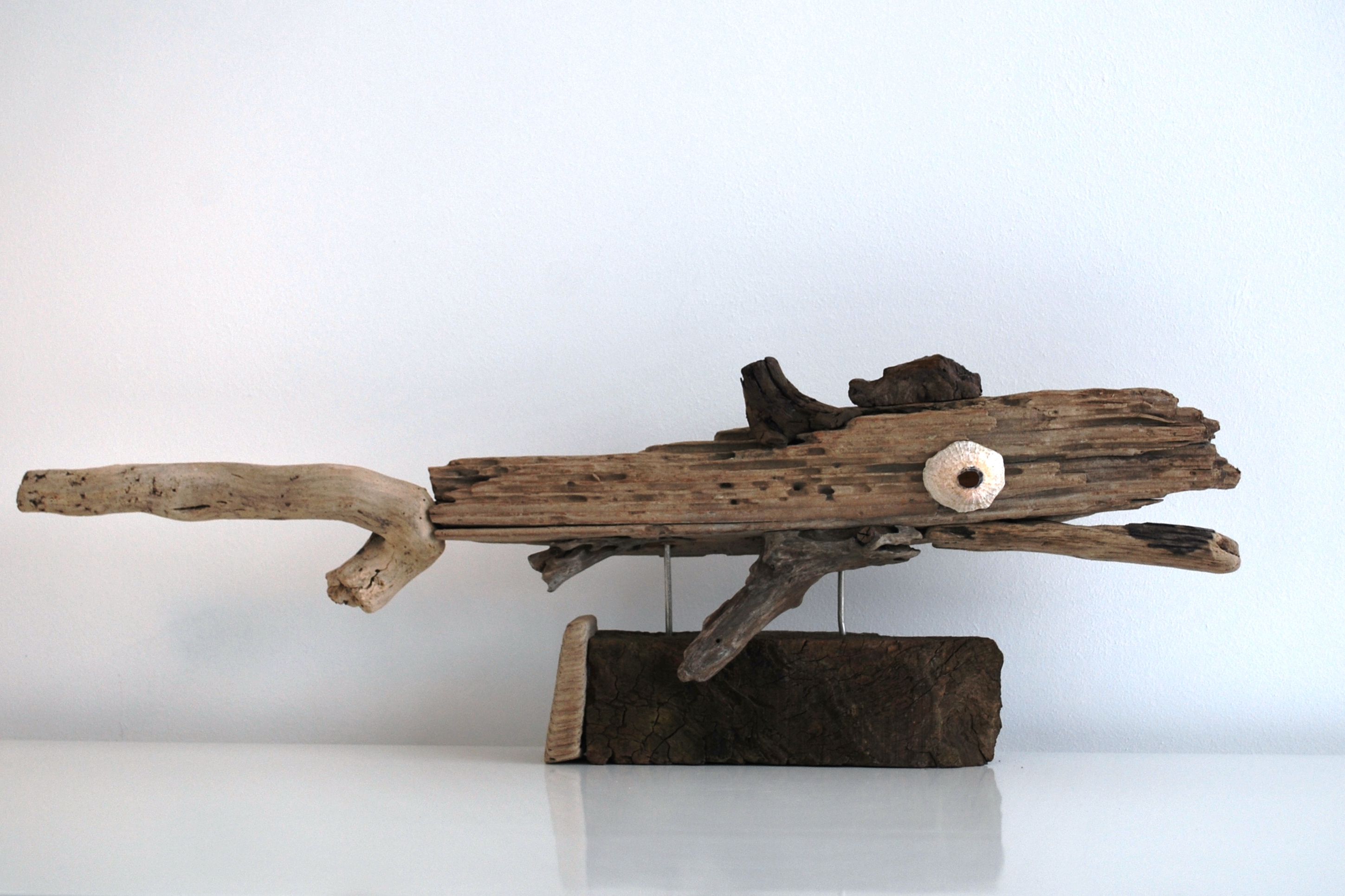 maakt al jaren houten beelden door natuurlijke objecten uit zee te koppelen. De beelden zijn ruw en puur.
