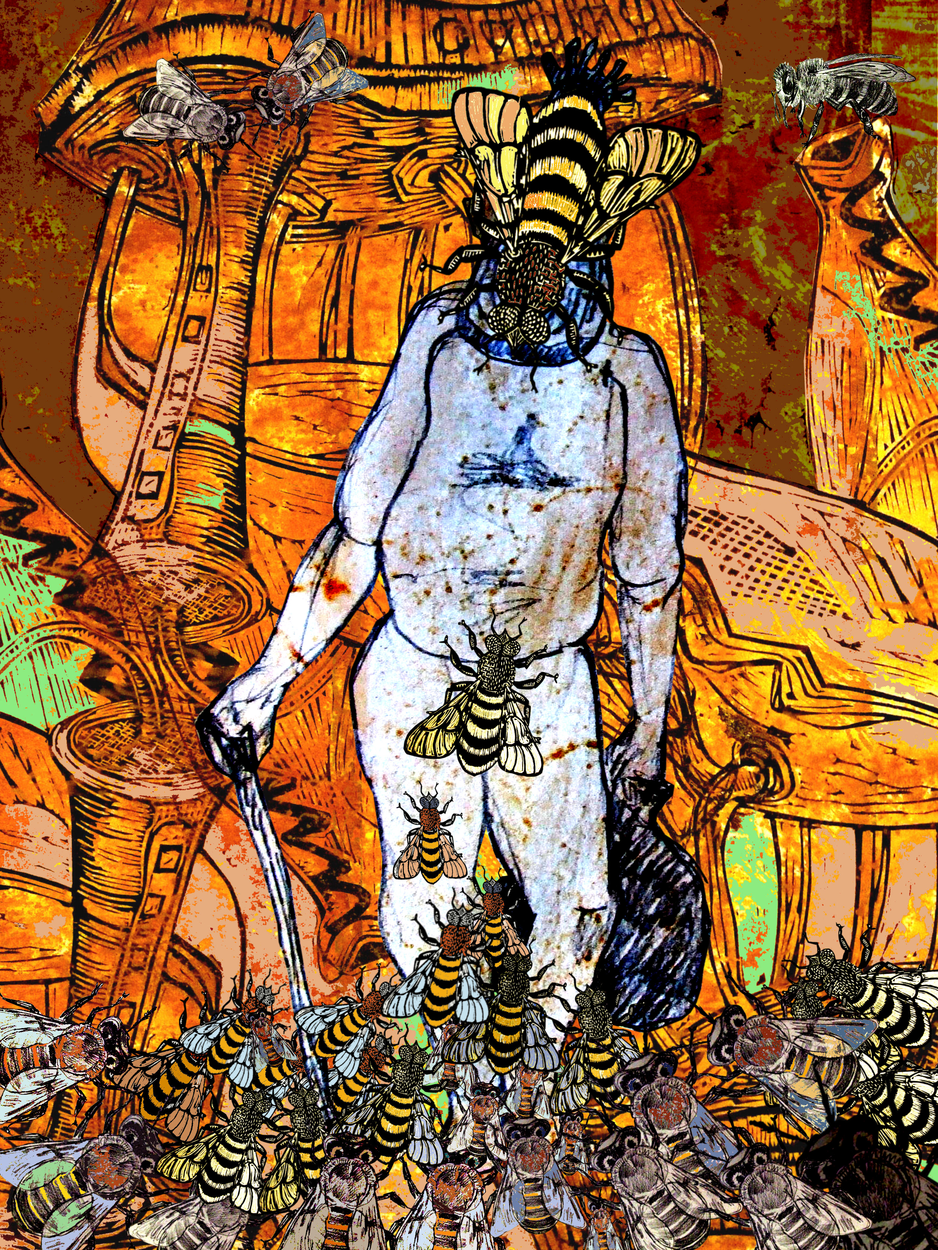 Digitale collage van mijn tekeningen en linosneden, geïnspireerd op het leven der bijen. Gedrukt op 310 grams Hahnemühle ets papier.