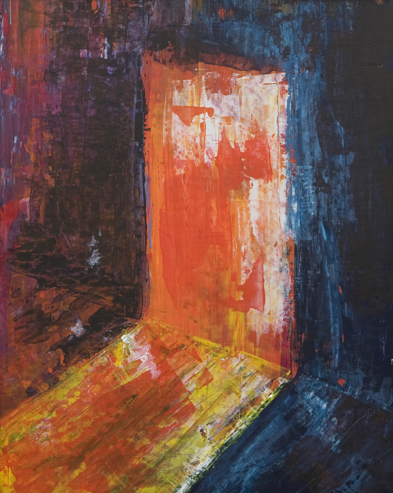 "HET LICHT" Acryl op karton. Ingelijst in zwarte lijst, barokstijl.