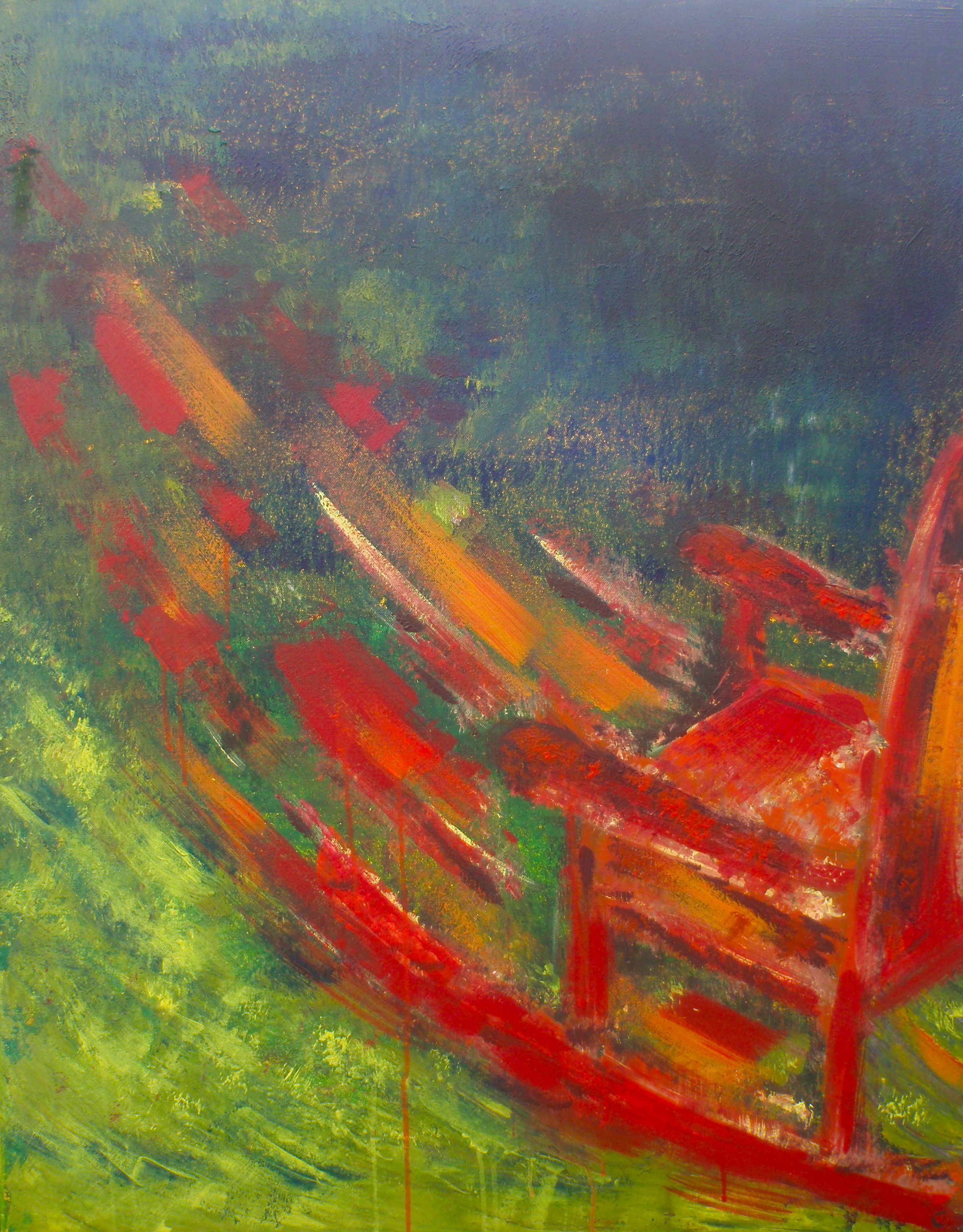 "ROCKING CHAIR" Acryl op linnen. Ingelijst in zwarte baklijst.