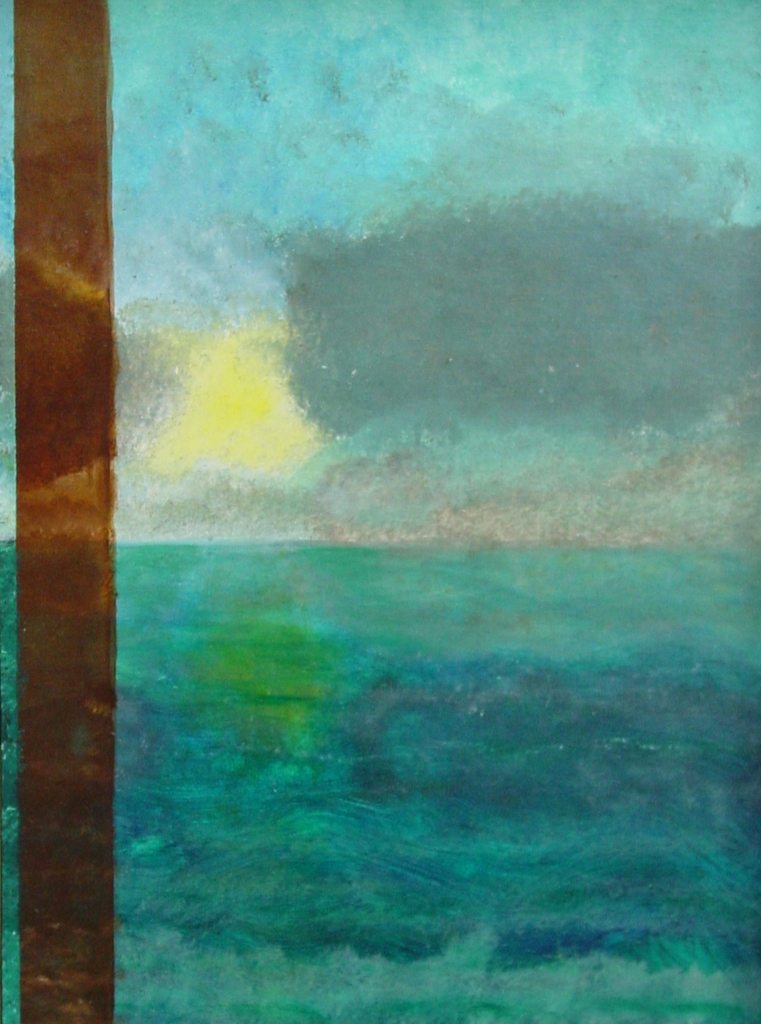 Schilderopdracht op Kunsteducatie om in lagen te werken en zodoende transparantie te bewerkstelligen naar het thema lucht, aarde en water.