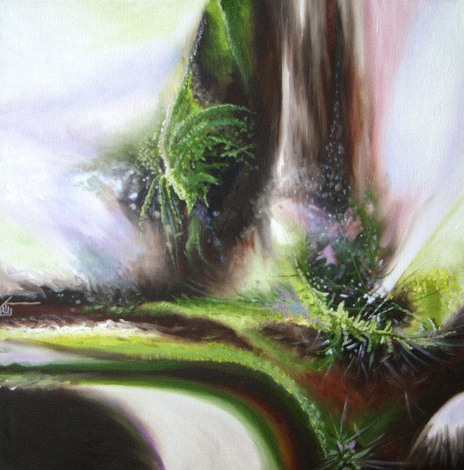 Lichtsferen en deva's in het bos... Olieverf met fotoscheursels