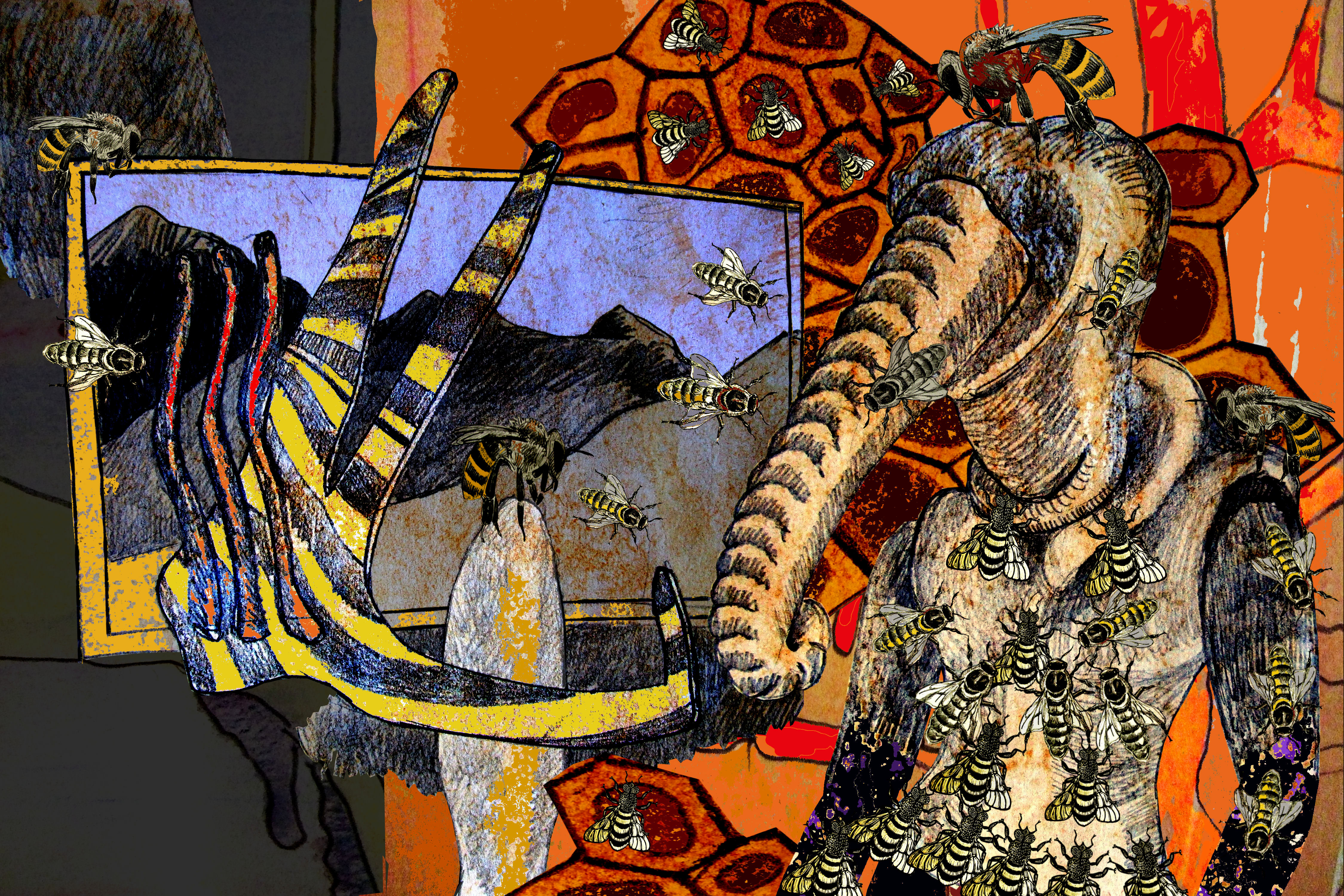 Digitale collage van delen uit mijn tekeningen, geïnspireerd op het leven der bijen. Gedrukt op 310 grams Hahnemühle ets papier.