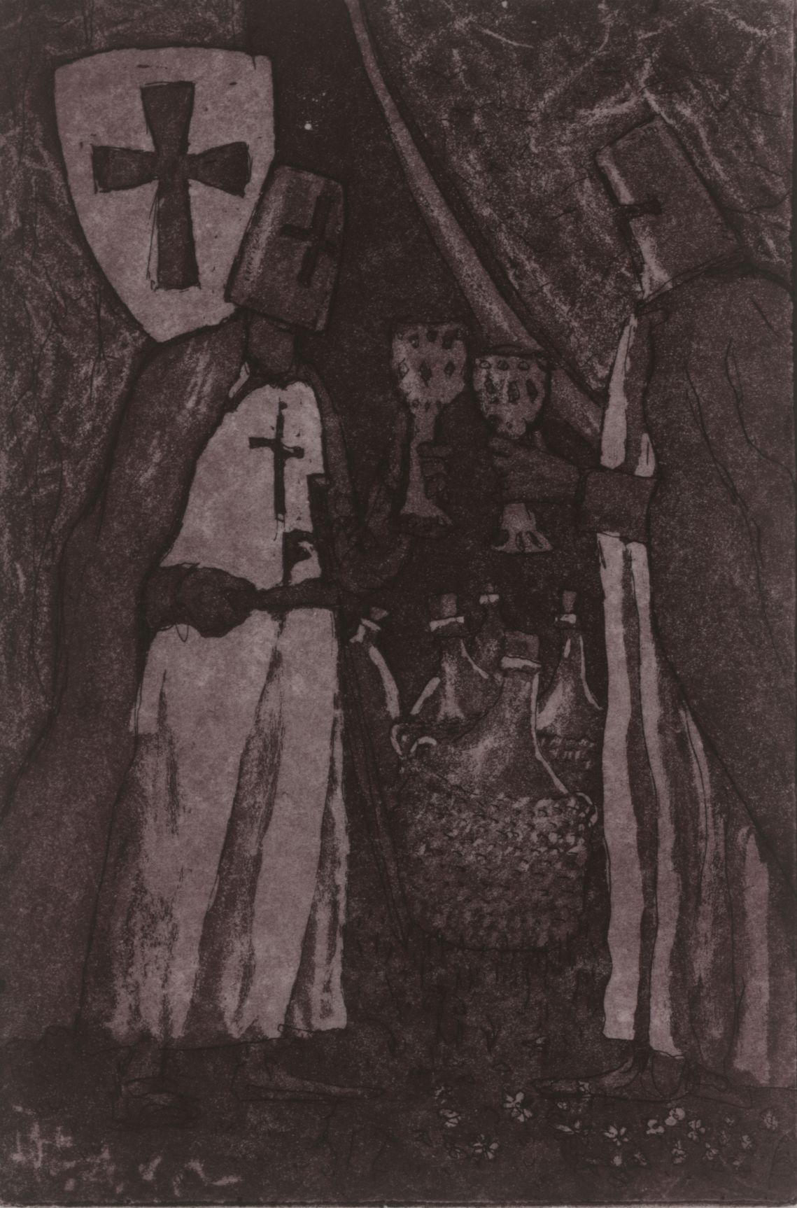 De tempeliers heffen het glas. In de tent achter hen is de schat zichtbaar: mandflessen wijn.