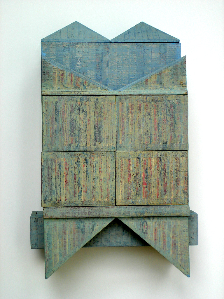 uit losse en uitneembare elementen samengesteld wandobject. hout papier, pigment.