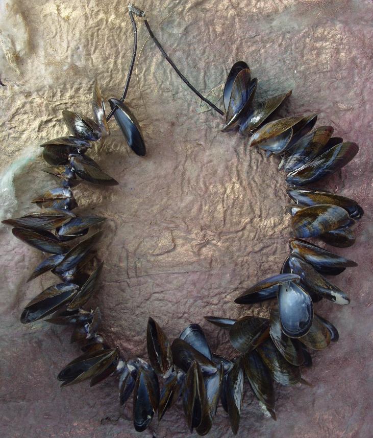 13. Mussel shells Mosselschelpen gelakt, gesloten vorm, glaskralen, nylondraad, anthaciet draaislot, 62 cm. Achtergrond handgeschept papier.