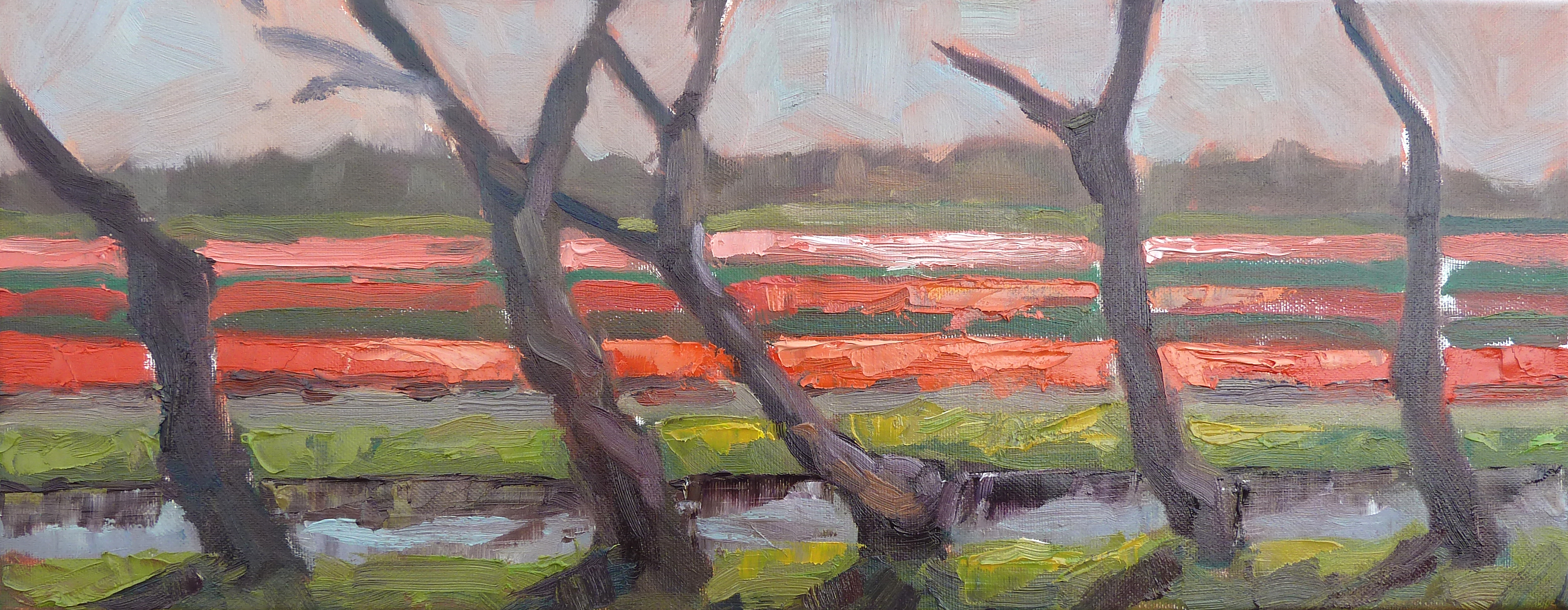 Zicht op de lente, rood tulpen veld achter bomen rij, Plein Air geschilderd.