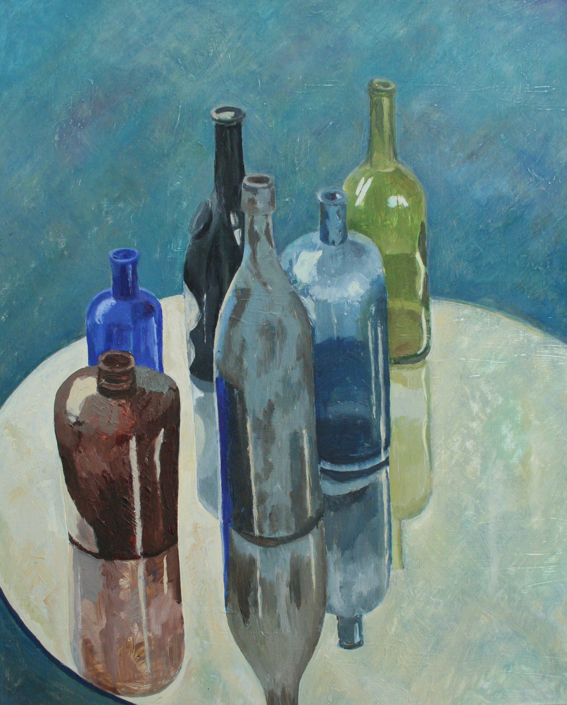 Stilleven van flessen op een spiegel, met een zilveren lijst