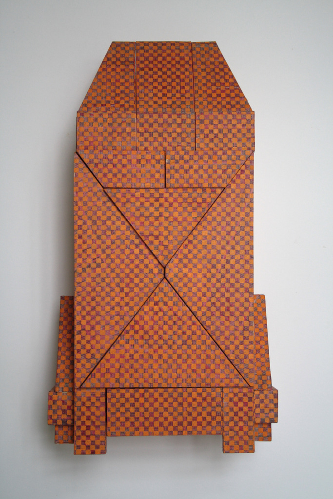 hangend object, hout papier olieverf. opgebouwd uit 14 elementen.