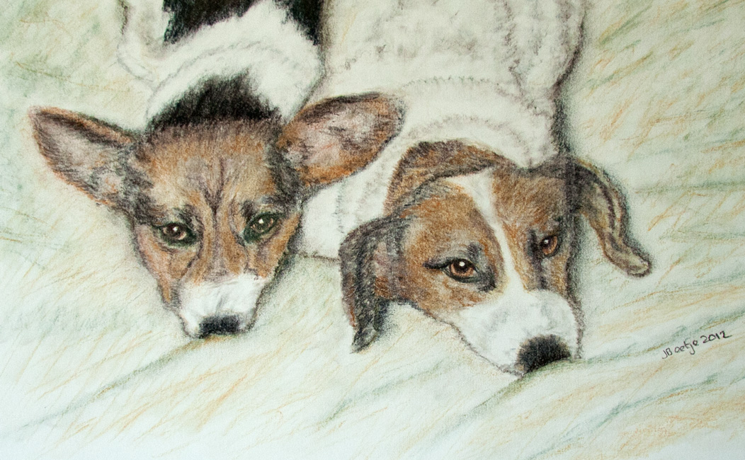 Skimpie en Dora zijn twee Jack Russels. Dora (links) is wel de drukste van het stel. Skimpie kijkt eerst de kat uit de boom.