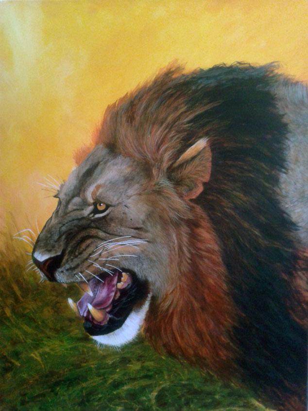 Schilderij van een jonge mannetjesleeuw. Hij heeft net een typische geur geroken en reageert daar in een reflex op. Het wordt een mooie dag op de savanne.