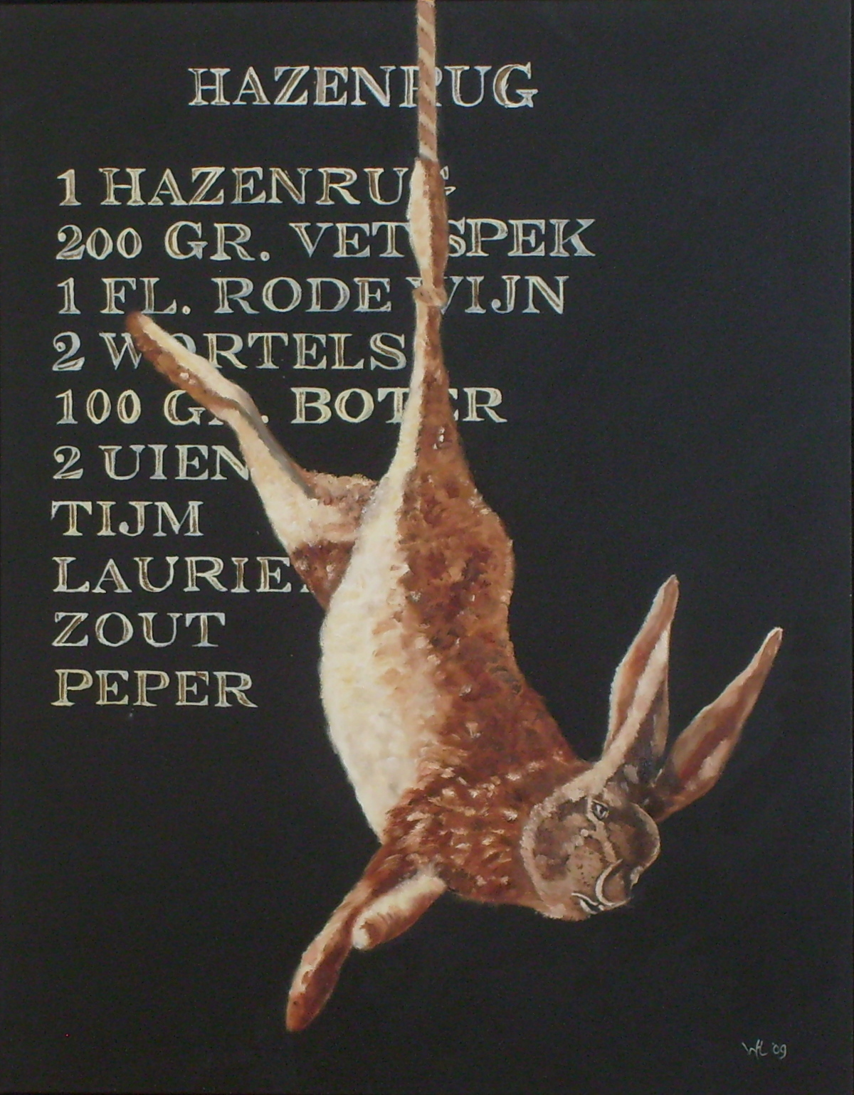 Hazenrug, haas aan een touw, met hierachter de ingrediënten voor de bereiding van het recept.