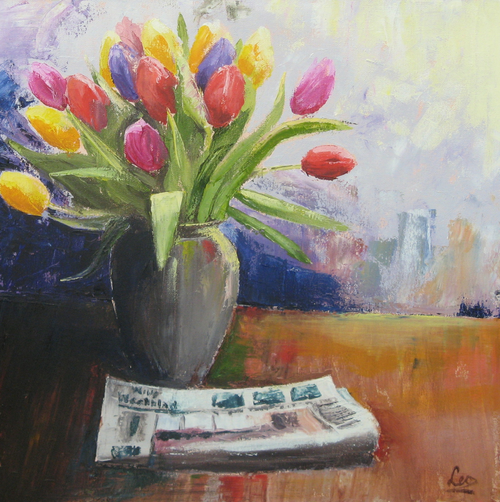 In dit werk ziet U een stilleven van een vaas met tulpen en een krant. Het Witte Weekblad is een gratis huis aan huisblad dat bij ons in de buurt werd verspreid. Het schilderij is geschilderd met paletmes. Dit verklaart de structuur van de verf.