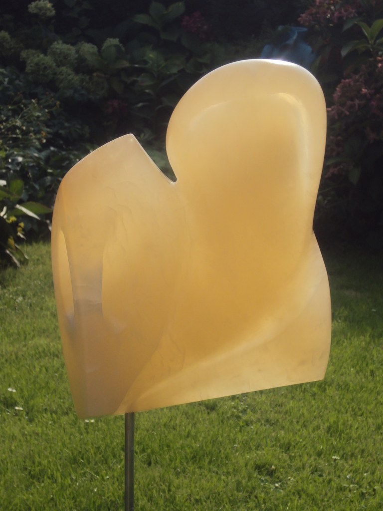 THEA SABELIS (1945)geboren te'sGravenhage .Mijn beelden zijn abstract ,de harde steen die ik bewerk tot een aaibaar lap stof.