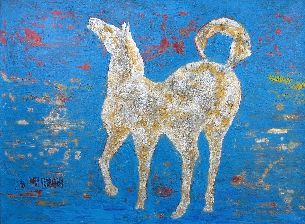 Paard in zilver op blauwe achtergrond
