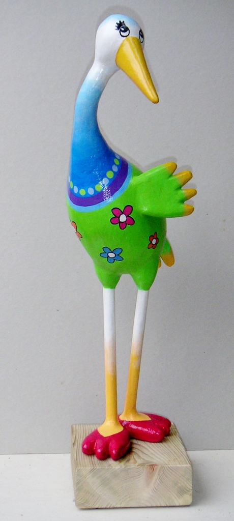 Trotse vogel, materiaal: Acrylic One en in vrolijke kleuren beschilderd.