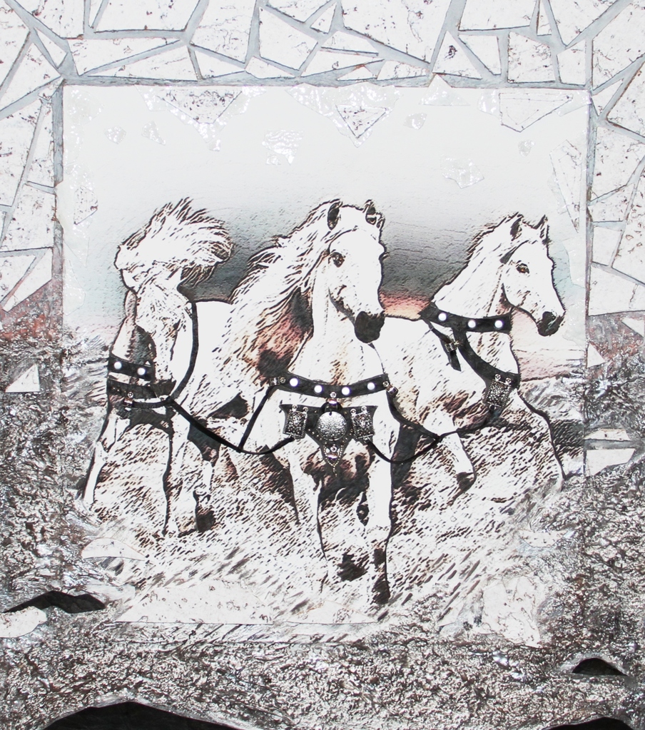 Stof, verf, kralen, leer, hout en meer. De onderdelen van collage zijn uitgebreid tot op de passe-partout.