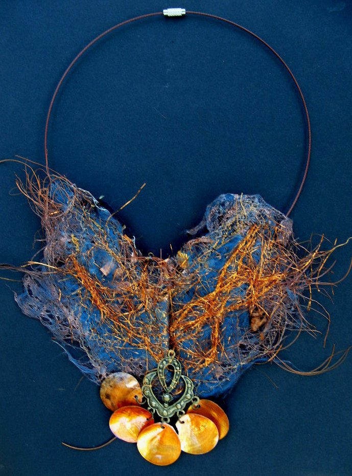 23.Vezels van wol en koper, ketting met parelmoerschelpen, spang 47 cm.