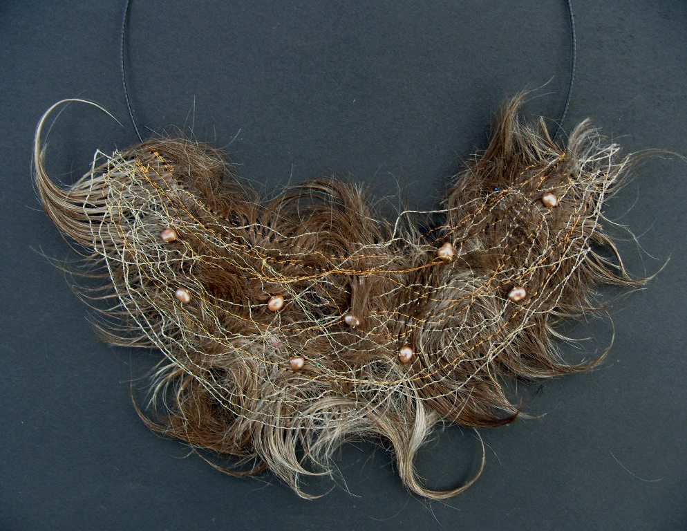 24.Haar van mensenhoofd,parelkralen,stiksels, spang 47 cm.