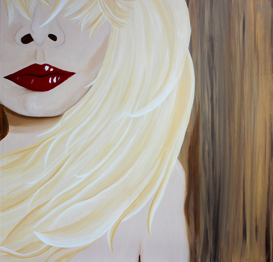 Potret van vrouw met blond haar en grote rode lippen.
