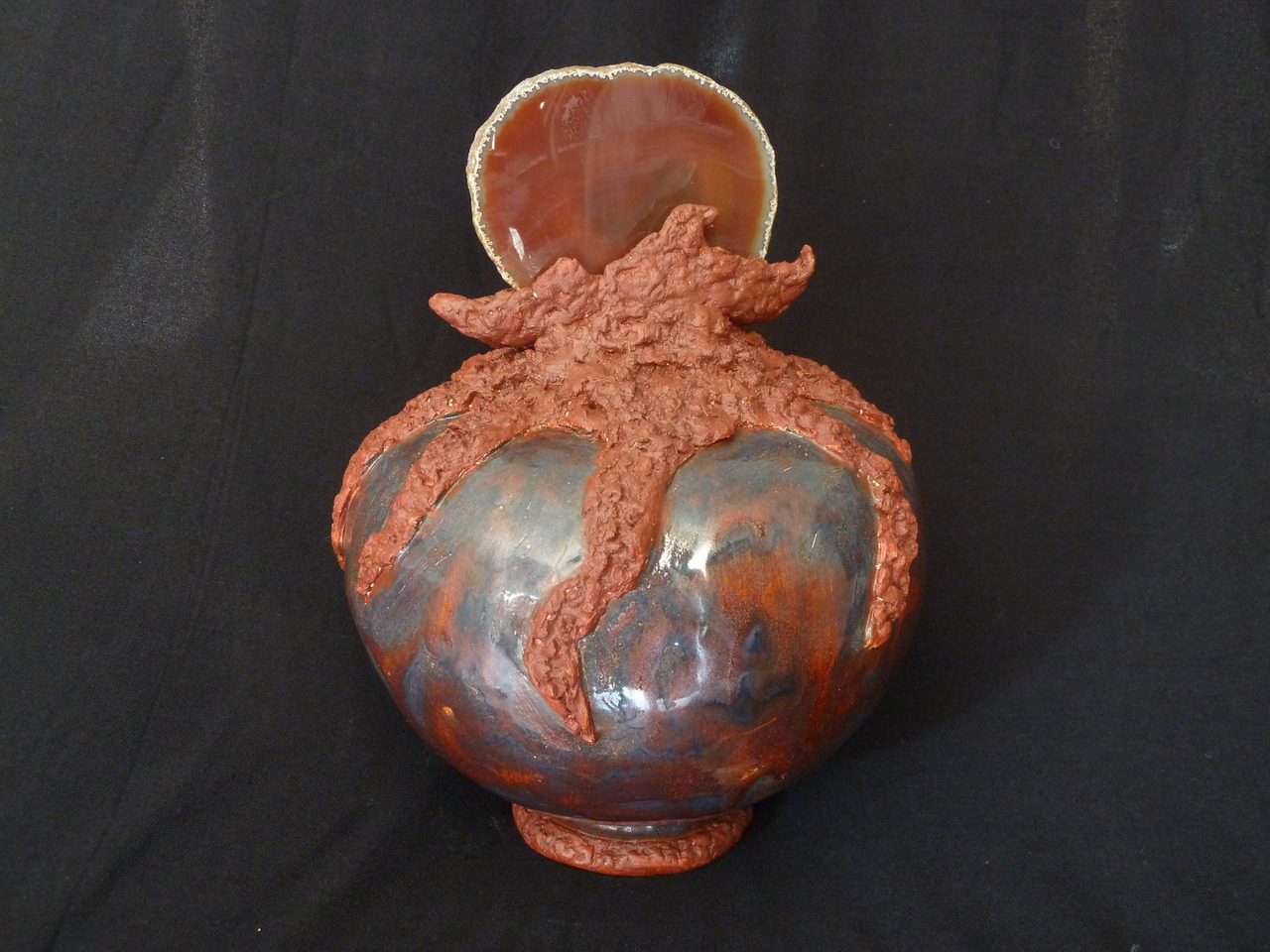 Roodbruine bol met een roodbruine schijf agaat erop bevestigd.