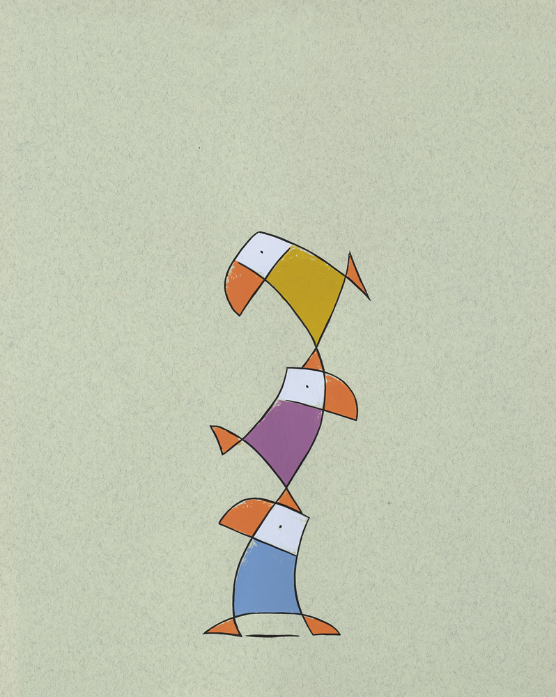 Kleurrijk schilderij van drie Duikertjes die op elkaar staan.